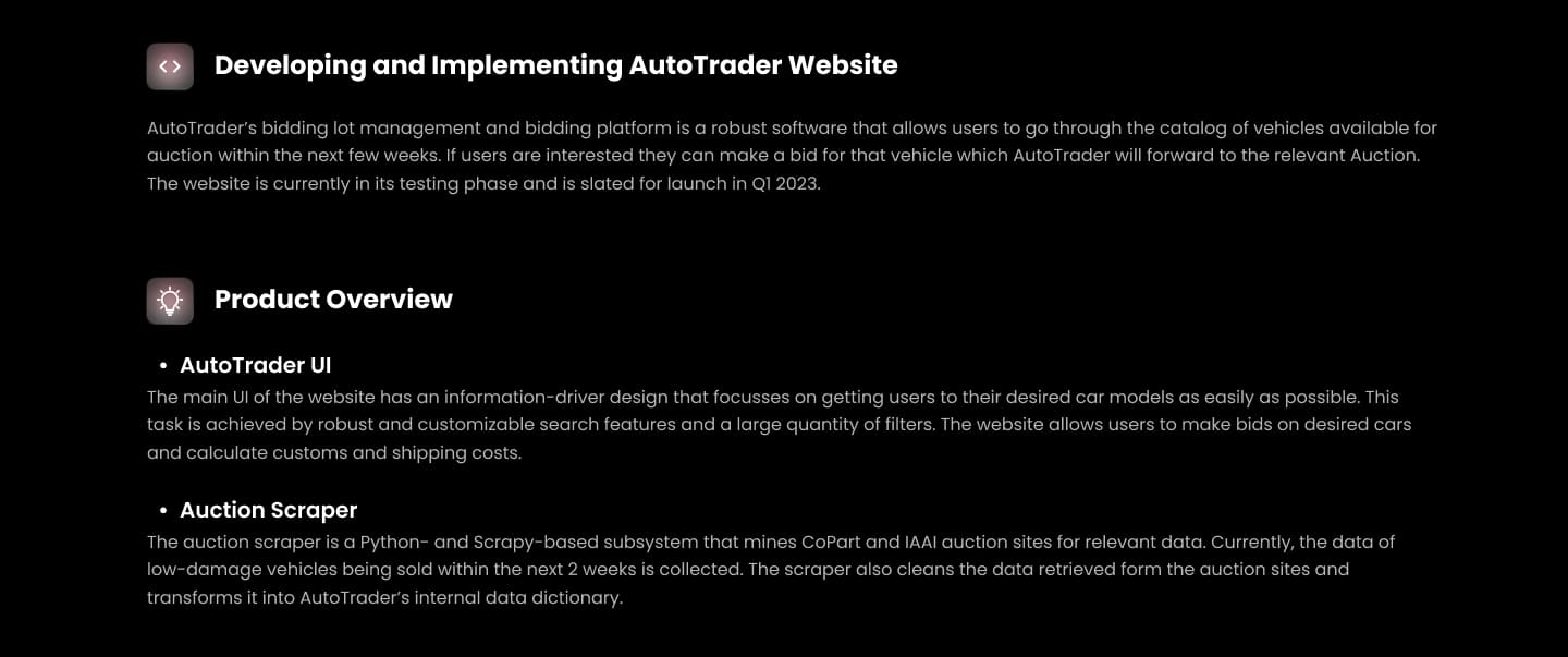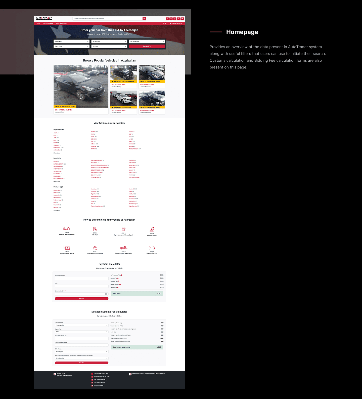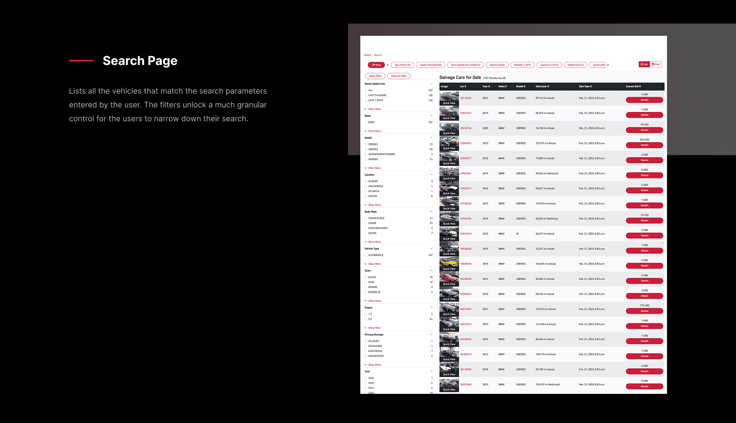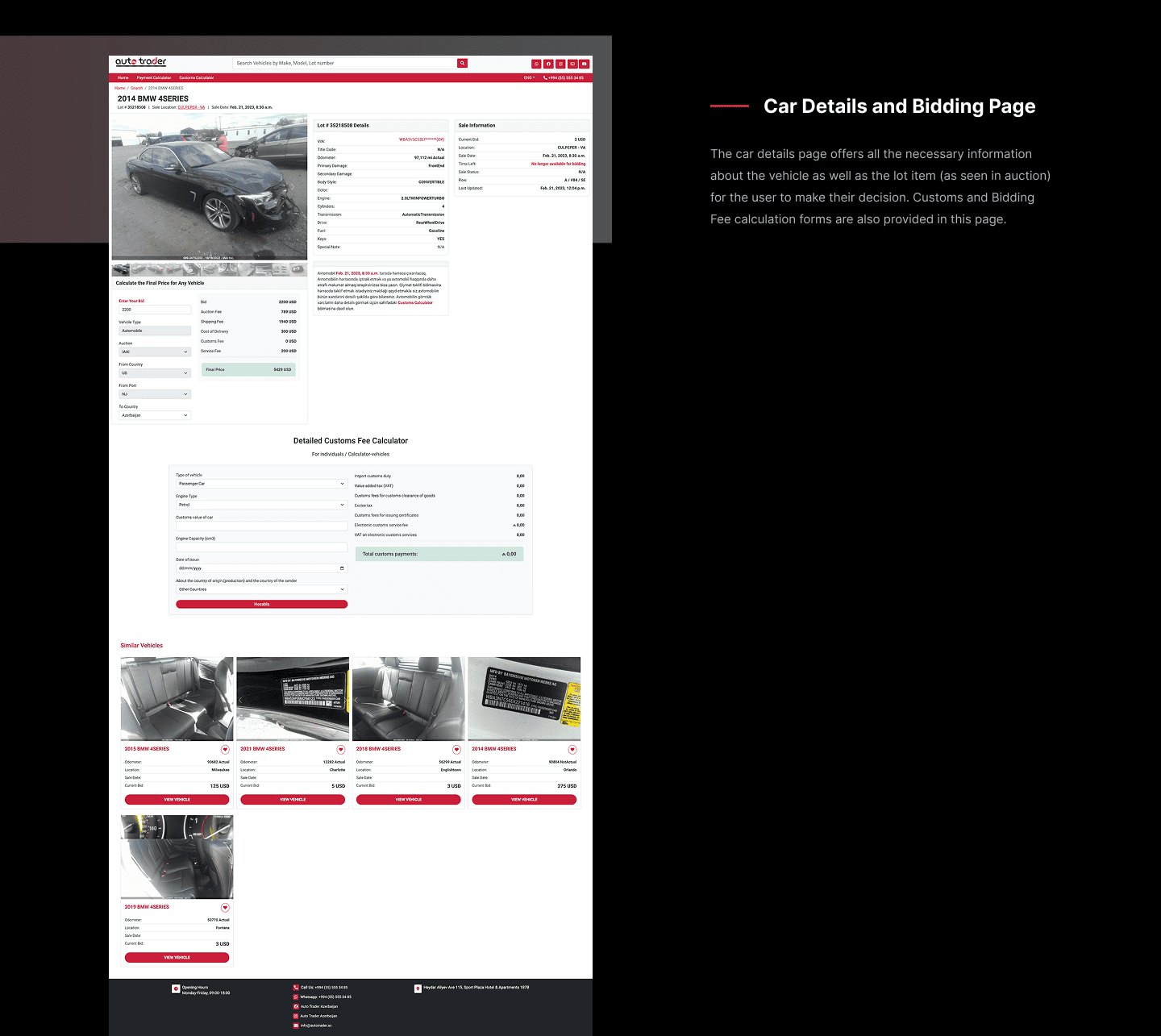 We crafted a clean and user-focused interface that simplifies a complex auction environment. Our UI/UX design services emphasized intuitive navigation, clear vehicle data presentation, and a seamless bidding experience. Users can easily browse listings, apply detailed filters, get shipping/customs estimates, and bid confidently. Every screen, homepage, search results, vehicle details, and bidding was designed with usability and clarity in mind.